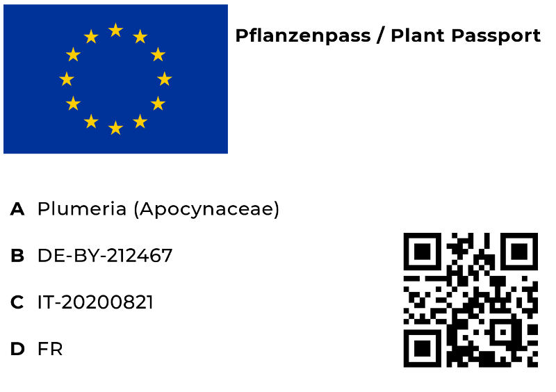 A növényútlevelet, azért vezették be, hogy jobban be lehessen azonosítani a növények eredetét, és garantálható legyen, hogy az ügyfél nem regisztrálatlan kereskedőtől vásárol ismeretlen eredetű, minőségű növényt. Valamint ezzel lehet nyomon követni a behurcolt betegségeket. Ugyan úgy működik, mint az élelmiszereknél! Az EU-n belül a növényútlevél 2020 óta kötelező, amikor növényeket értékesítenek magánszemélyeknek. Ha egy növényt növényútlevél nélkül küldenek vagy adnak el, ez az eladó felé büntetést vonhat maga után. Tehát a biztos minőség érdekében csak ilyen útlevéllel ellátott növényt vásároljatok! A növényútlevelet a kereskedőnek az aktuális ország hatóságánál kell kérelmezni . A kereskedőnél vizsgálják a tárolási feltételeket és a növények megfelelő gondozását. A kertészetben pedig, azért szükséges, hogy követni tudják a növény útját, ha betegség vagy kártevők után néznek, hogy honnan érkezett az adott országban. Ezzel az útlevéllel a növények minőségét is garantálják, hisz regisztrált a kertészet, ahonnan a növény érkezik. Ügyfélként mindig ügyelj arra, hogy növények vásárlásakor mindig legyen növény- útlevél a a Plumeria -hoz. Növényeink mindegyike rendelkezik EU növényútlevéllel, ezért jogunkban áll az EU-n belül az összes tagállamában értékesíteni. Ezzel garantáljuk a magas színvonalú növényértékesítést ! A A növény latin neve pontosan, fajtája (nem kötelezö) B A kereskedő növényútlevél-száma, akitől vásárolták C A kertészet nyomon követésének száma (gyakra szállítólevél száma) D A növény származási országa. Ezenkívül létezhet QR-kód, amely a kiskereskedő honlapjára vagy további információkra utalhat.EU növényútlevél – Vajon mire jó?