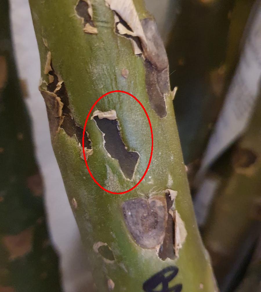 Előfordul, hogy a dörzsölések miatt apró fekete foltok jelennek meg a dugványokon. De ne ess pánikba! Tehát nem kell pánikba esni, hacsak ez a terület nem sérül meg mélyen. Néhány dugvány szárán apró „hólyagok” keletkeznek. Lásd a 2. és 3. képet. Ne használj rá semmilyen vegyszert. Ezek normál kis horzsolások a száron a dörzsölés következtében, amelyek begyógyulva újra fásodnak. Egyszer nagy felbontással lefényképeztük ezeket a kis hólyagokat. Jól látszik, hogy csak felszíni sérülésről van szó, ami nem okoz betegséget a növényünknél. Sok szerencsét kívánunk a dugványok gyökereztetéséhez! fekete foltok a plumeria dugványon kis barna hólyagok a Plumeria dugványon A kis hólyagok nem kártevők Megfejtettük a bal oldalon feltett kérdést. Ezek régi hólyagok, amelyek elhaltak és megfásodtak. Nem ajánlott erőszakkal eltávolítani, mert ez károsítja a növényt és baktériumok kerülhetnek a növénybe a sérülésen keresztül.Semmi pánik! NEM beteg!