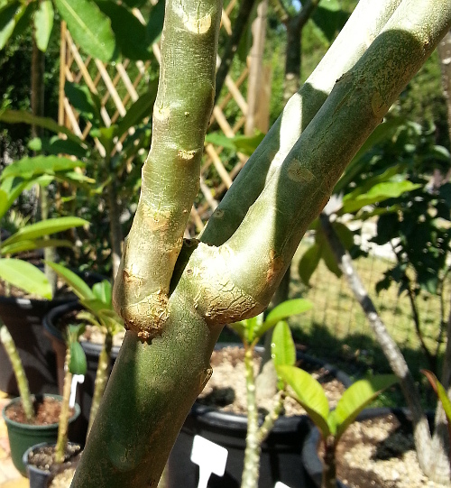 Mit tehetek annak érdekében, hogy elágazzon a Templomfa ? Hány éves korban fog elágazni a Frangipani -m ? Mikor ágazik el a Plumeria? A plumeria / templomfa az esetek körülbelül 80% -ban, csak virágzás után ágazik el A magról nevelt pluméria / frangipani először gyertyaként nő felfelé egyenes szárral, akár 1,5 m magasságig. Nagyon ritkán fordul elő a fiatal növényeknél, hogy elágaznak, ez alig haladja meg az esetek 1-3% -át. A magról nevelt plumeria magonc, mint már említettük kb. 5 és 20 év között virágzik előszőr és a virágzást követően a virág helyén lesz az elágazás az esetek túlnyomó részében. Ritka kivétellel virágzás nélkül is elágazhatnak a fent leírt gyakorisággal. Ha a növény nagyon fiatal, az elágazás az esetek 70% -ban a hajtás hegyének levágásával érhető el, ez azonban a szép formáját fogja eltorzítani! Általánosságban azonban az első virágzás után kezdenek elágazni. Előfordulhat, hogy így 2-3 vagy akár 5 új hajtást is eredményez. Sajnos az is előfordulhat, hogy a frangipani nem ágazik el a virággal, hanem tovább növekszik felfelé. Mit tehetek, hogy még is elágazzon? Igen, ez a hajtás hegyének levágásával elérhető. Az új hajtás azonban „nem lesz szép, mert a növény ekkor ismét 1–4 helyen hajt ki a vágás alatt valamivel, a fennmaradó rész pedig „tuskóként” megmarad. Tehát, ha nem feltétlenül szükséges a rangipani megmetszése, akkor inkább ne alkalmazd! A természetes ág sokkal szebben néz ki, mint ha mesterségesen próbálod elágazásra bírni a növényt! A pluméria később is elágazhat egy régi levélhajtásnál? Nem. A felnőtt növények nagyon ritkán hajtanak ki a régi levélhajtásokon, ezek 90% -át elveszítik, vagy nem nőnek tovább. Tehát nagyon ritka, hogy új hajtás bukkan fel valahol egy felnőtt növény törzsén. Ág vágás után Természetes elágazás Virágzás után természetes elágazásAz egyik leggyakoribb kérdés