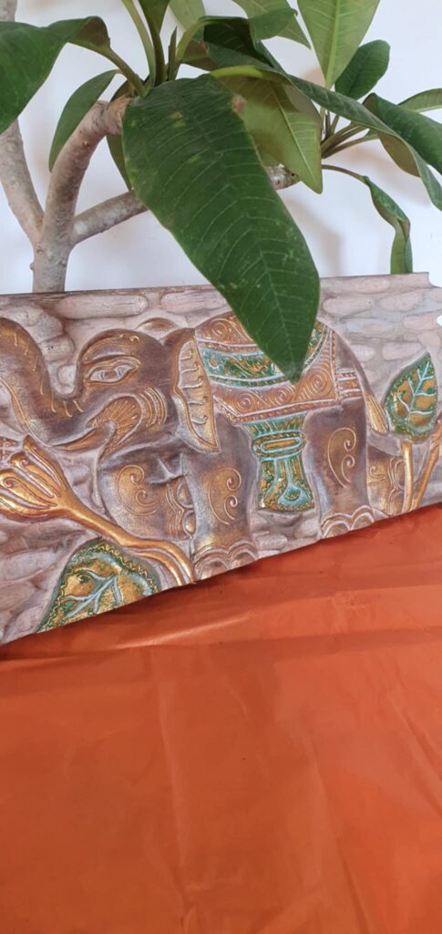 Fa falikép – kézzel faragott elefánt motívummal (50x20 cm) Ez az egyedi, kézzel faragott fa falikép a balinéz kézművesség különleges példája, amelyben a hagyományos motívumok és a természetes anyagok harmonikus egységben jelennek meg. A 50x20 cm méretű tábla tömör fából készült, felületét egy részletgazdag elefánt motívum díszíti, melyet autentikus bali minták egészítenek ki. A faragás finoman kidolgozott, a domináns zöld és arany színek elegáns kontrasztot alkotnak, és még jobban kiemelik a műalkotás mélységét és karakterét. Ez a falikép nemcsak egy dísztárgy, hanem egy időtálló, kulturális értéket hordozó alkotás, amely melegséget és egyediséget visz bármely térbe – legyen az otthon, iroda ...