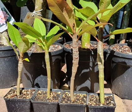 A Plumeria palánták általában 6-8 hónaposak. Különböző anyanövényekből származnak, amelyek nevét nem adjuk meg, mert a palánták esetében mindig figyelembe kell venni a genetikai öröklődést. Soha nem lesz megegyező tulajdonságú az anyanövénnyel! Amint azt már a mag információs oldalunkon is írtunk, magról való neveléskor nem szabad a fajtát az anya nevével azonosítani, mivel soha nem lesz 100 %-ig azonos az anyanövénnyel a magról nevelt frangipani palánta. Legfeljebb „Seedling” (angolul jelent Magonc). A „Lueang Supan” nem a „Lueang Supan” növényből származik, csak a „Lueang Supan Seedling”, egy leszármazott, amely az anya genetikai jellemzőinek legfeljebb 50% -át örökli. Ezek a jellemzők a következők: szín, illat, növekedési szokás, levélforma és különböző növekedési jellemzők. Mivel az öröklési tényezők olyan nagymértékben változtatják meg az eredeti fajtát, 100% -ban garantált, hogy a magból kikelt Plumeria magonc mindig új fajtát eredményez. Lehet, hogy hasonlít az anyanövényre, de az illata, színe vagy a növekedési jellemzői, a levél alakja eltérő lesz. NEM! Meg kell várni a 3. virágzási ciklust, amíg a forma, szín és illat stabil nem lesz. Minden tulajdonság teljesen megváltozhat a 3. virágzásig. Ha egy plumeria palánta valóban jól gondozott, és sok napot kap, akkor (ismét ez a genetikai információk miatt van) 2-4 év után is lehet az első virágzás. Ezt követően a növény 80-90% -os biztonsággal elágazik, és a második virágzás ezt követően még 2 év múlva várható. A Plumeria magonc ekkor is elágazik, és a harmadik, utolsó virágzás (forma, szín és illat) 1-2 év múlva várható.Plumeria rubra palánták